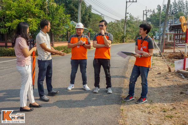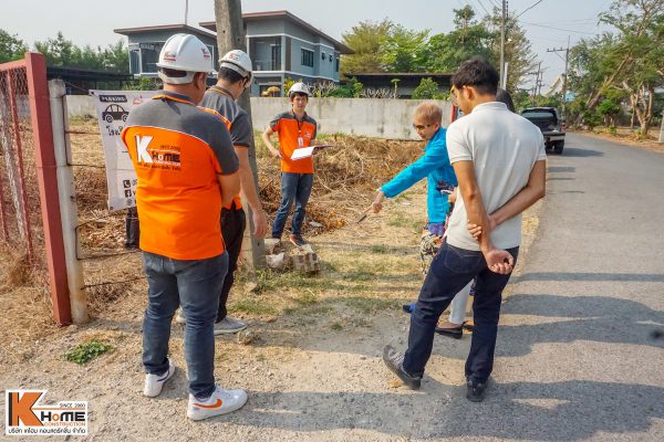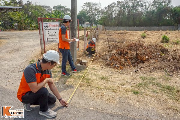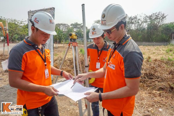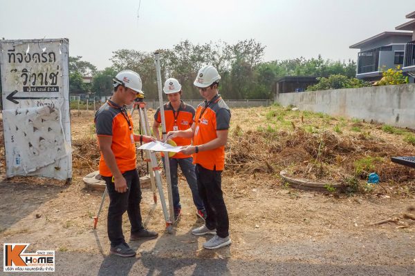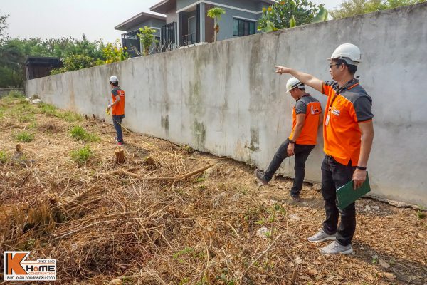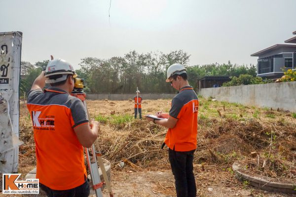ทีมงาน บริษัท เค โฮม คอนสตรัคชั่น จำกัด นำโดยวิศวกร และสถาปนิก ได้เข้าสำรวจที่ดินที่จะปลูกสร้างของลูกค้า เพื่อทำการเก็บระยะที่ดิน ระดับพื้นดิน ภูมิทัศน์ และสภาพแสดล้อมโดยรอบ ตลอดจน ระบบสาธารณูปโภคต่างๆ เพื่อมาประกอบการออกแบบก่อสร้างให้กับลูกค้า