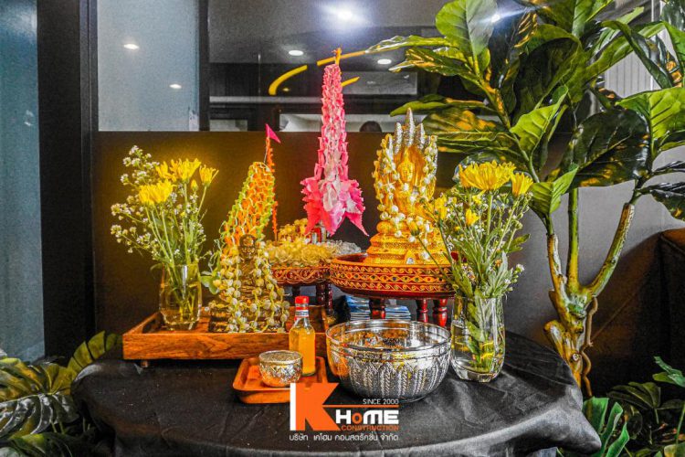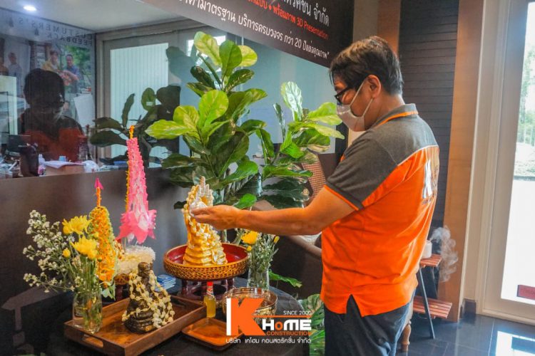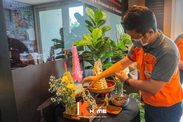 เช้านี้พนักงานของบริษัท K – Home Construction ได้เข้าขอพร รดน้ำดำหัว จาก ผู้อาวุโส และผู้บริหารของบริษัทฯ เพื่อความเป็นสิริมงคล และร่วมสรงน้ำพระ เพื่อสืบสานฮีตฮอย ป๋าเวณีปี๋ใหม่เมือง ทั้งนี้ พนักงานทุกคนที่ร่วมพิธี ได้ปฏิบัติตัวอย่างเคร่งครัด เกี่ยวกับแนวทางปฏิบัติ เพื่อป้องกันการแพร่ระบาดของเชื้อไวรัสโคโรนา 2019 (COVID-19) โดยการตรวจวัดอุณหภูมิร่างกายพนักงานทุกคนก่อนเข้าร่วมพิธี ล้างมือด้วยเจลแอลกอฮอล์ที่จัดเตรียมไว้ให้ และ สวมหน้ากากอนามัยตลอดระยะเวลาที่ร่วมพิธี